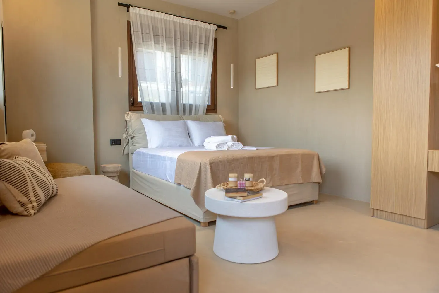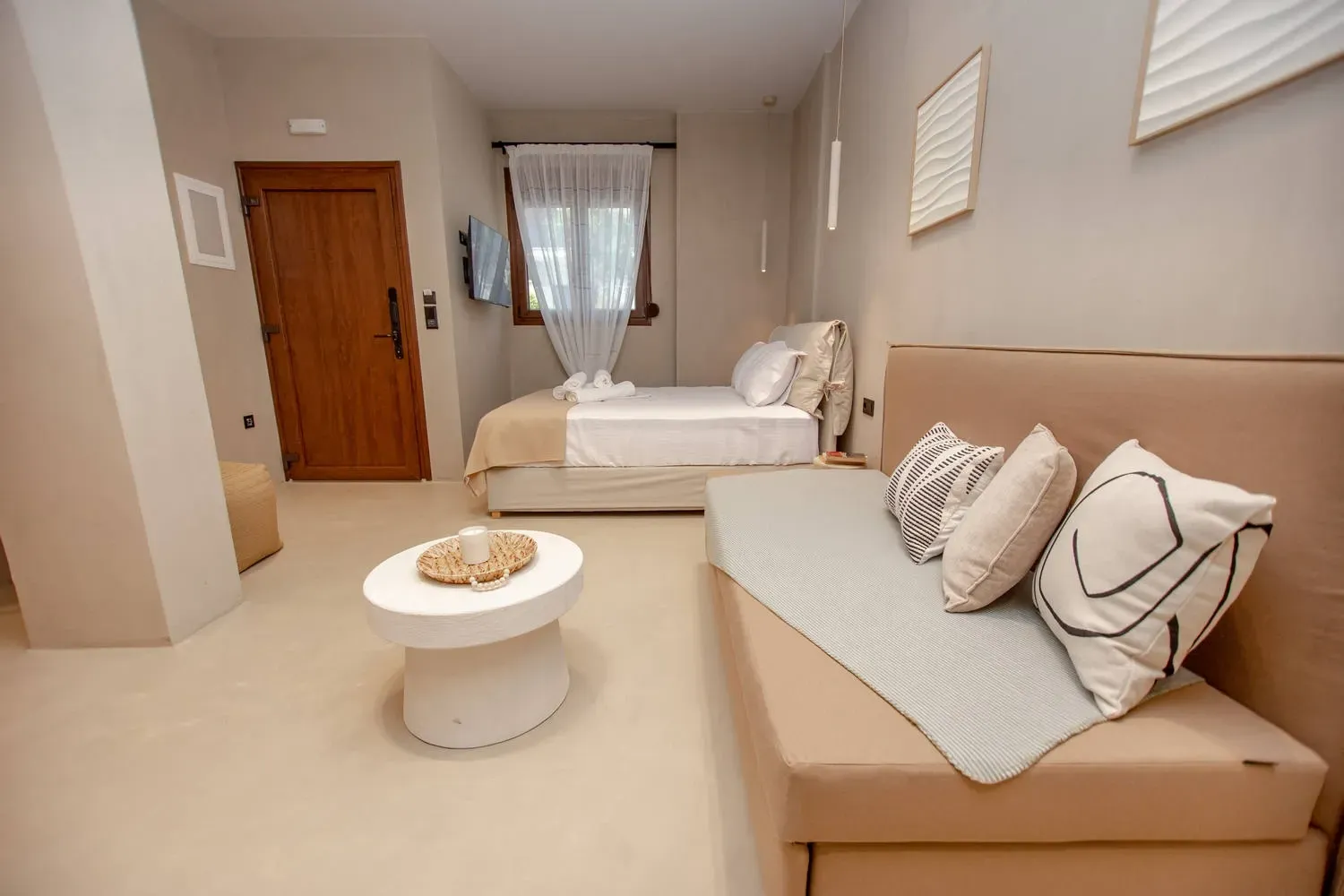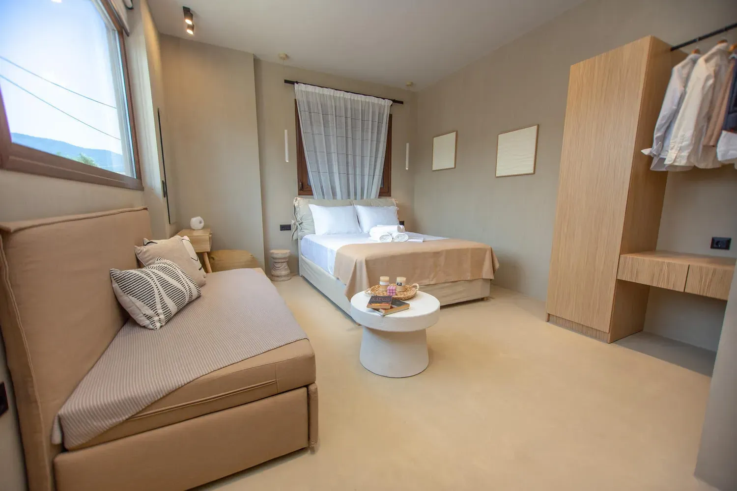 Περιλαμβάνει διπλό κρεβάτι και καναπέ-κρεβάτι, προσφέροντας άνεση και λειτουργικότητα.