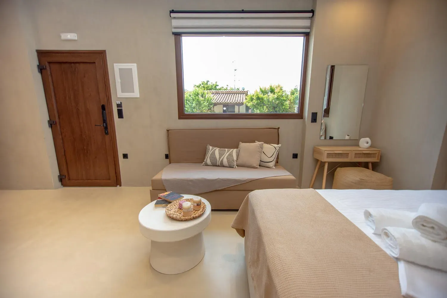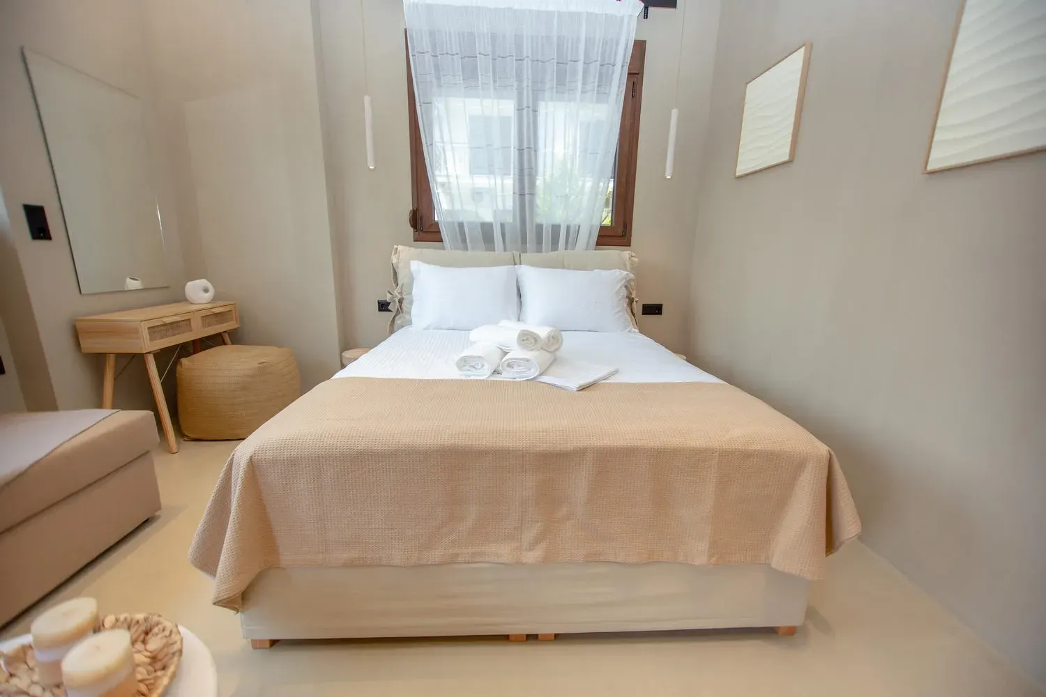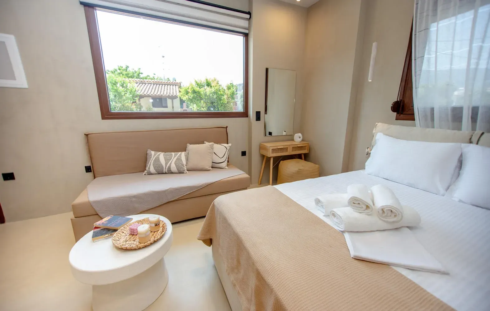 Περιλαμβάνει διπλό κρεβάτι και καναπέ-κρεβάτι, προσφέροντας άνεση και λειτουργικότητα.